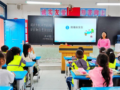 活动中,各班级老师充分结合学生的年龄与认知特点,摒弃枯燥的说教,用多样化的方式让安全知识入脑入心。课堂上,老师依次播放交通安全、防溺水、消防安全等主题的动画短片与实景视频,用直观的画面让学生清晰识别马路上的“隐形陷阱”、水边的危险区域;同步展示安全警示图片,结合生活实例细致讲解过马路“一停二看三通过”、居家用电“三不碰”等具体防护要点;还通过讲述“小明假期安全小故事”等趣味内容,让学生在聆听与讨论中,轻松掌握出行、居家、饮食等多方面的安全常识。同时,针对双节期间家庭外出游玩多、人流车流密集的特点,老师重点强调了不私自结伴去野外水域戏水、不随意触碰易燃易爆物品、外出时紧跟家长不远离等安全事项,引导学生主动提高自我保护意识,学会在遇到突发情况时及时向大人求助。