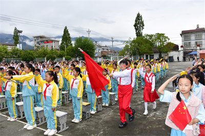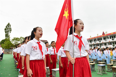仪式在庄严的升旗仪式中拉开序幕,鲜艳的五星红旗冉冉升起,全体师生肃立致敬,随后,出旗曲奏响,旗手们迈着整齐的步伐护队旗入场,全体队员庄严敬礼。“我们是共产主义接班人……”嘹亮的队歌响彻校园,歌声里满是对少先队的热爱。