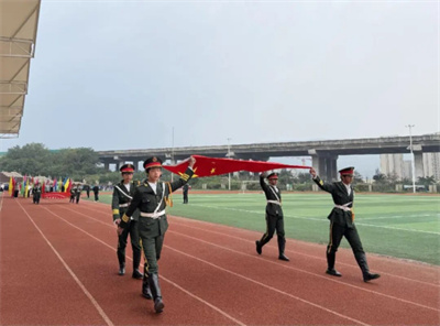 迈着整齐的步伐,国旗、校旗护卫队率先入场。鲜红的旗帜在阳光下熠熠生辉,每一步铿锵都承载着信仰,每一次摆臂都传递着力量,瞬间点燃全场的气氛。